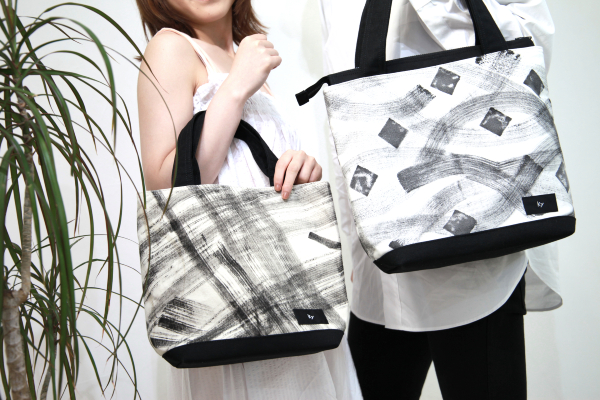 (左)大きな筆を使用して描いたテキスタイルのトートバック。