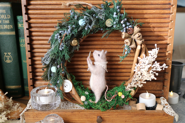 ねずみさんがたからもののボタンを大切に飾っている様子をリースで表現されたこの作品。