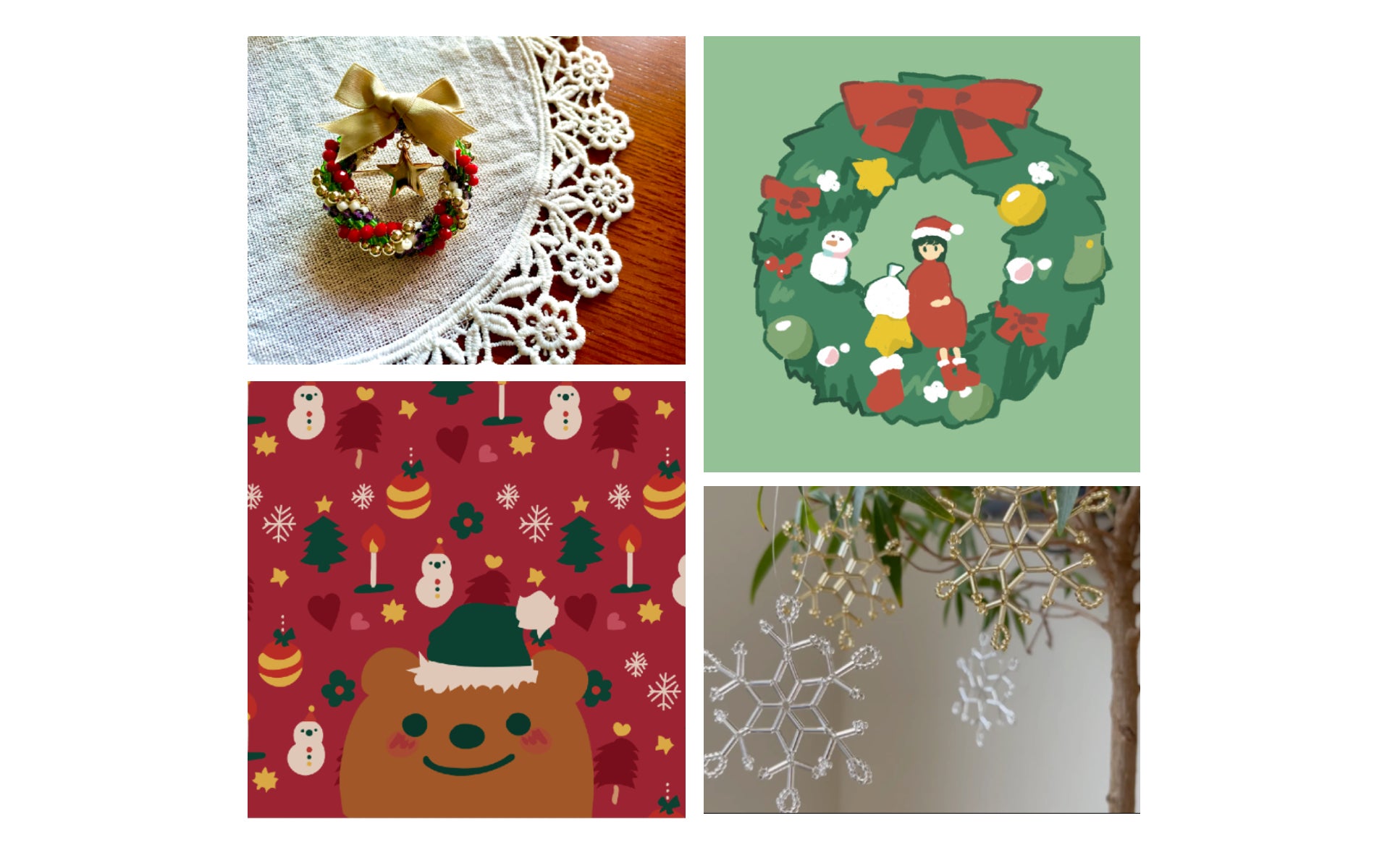 身近な材料で気軽に作れる雪の結晶のオーナメントや、バッグやコートに身につけられるクリスマスブローチといったハンドメイドアクセサリーを制作するクラスの他、クリスマスまでに簡単なイラスト&デザインスキルを身につけたい人に向けたデジタルイラストのクラスです。